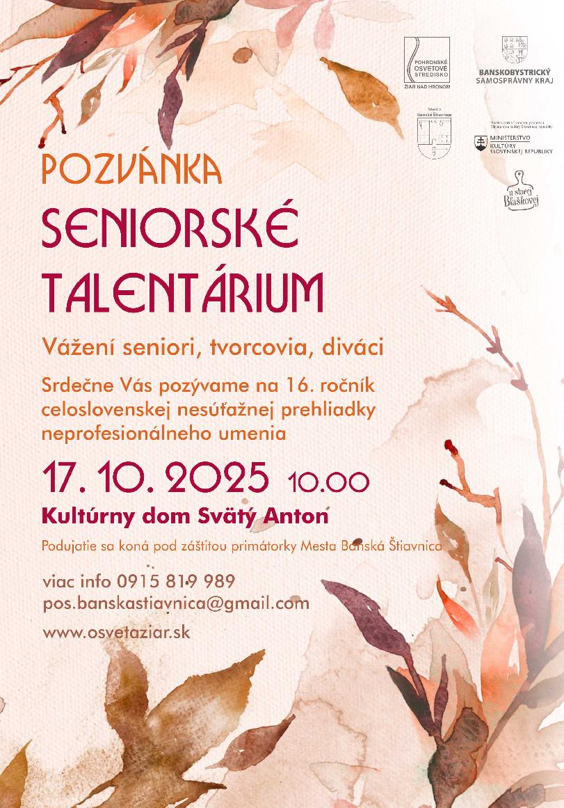 Srdečne Vás pozývame na 16. ročník celoslovenskej nesúťažnej prehliadky neprofesionálneho umenia – Seniorské Talentárium, ktorá sa uskutoční: